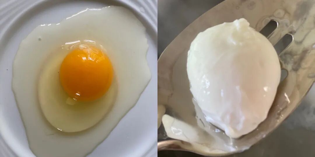 不光是膜,打个鸡蛋给你看看。从鸡蛋的图上我们还可以看到:鸡蛋有两层蛋白,一层是外围的稀的蛋白。主要成分90%是水,为新生命提供营养。另一层是围着蛋黄的厚的蛋白,它是更透明交织的纤维状胶囊,为蛋黄提供了更稳定的保护。这就是我们今天烹调的妙招所在,去掉外面那层稀的蛋白,就是去掉不稳定因素。你会发现分开稀蛋白和厚蛋白其实是一件很简单的事情,稀蛋白轻松滑落,而厚蛋白与蛋黄牢牢锁定彼此,不离不弃。烧锅开水,关火(这点很关键,不然就出不了那种流动的心了),加入厚蛋白与蛋黄,静置3-4分钟,妥妥的你就能做出五星级的班尼迪克蛋了。